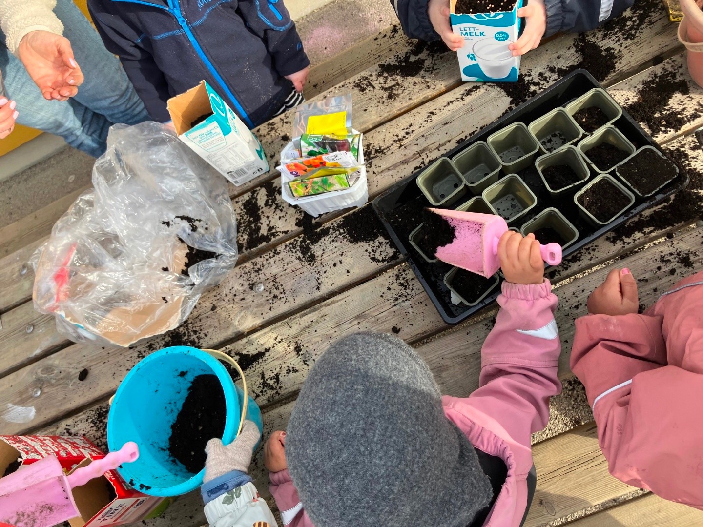 Det er vår i luften og vi har sådd frø. Frøene skal foreløpig få stå inne og spire og gro, til de er klare til å bli plantet ut på uteområdet vårt. Barna deltar ivrig i såingen og vanningen, og synes det er spennende å følge prosessen fra frø til plante <3 Rammeplanen sier at barnehagen skal bidra til at barna opplever og utforsker naturen og naturens mangfold. Ved å så frø og stelle planter lærer barna om livssykluser og får en tidlig forståelse for bærekraft.