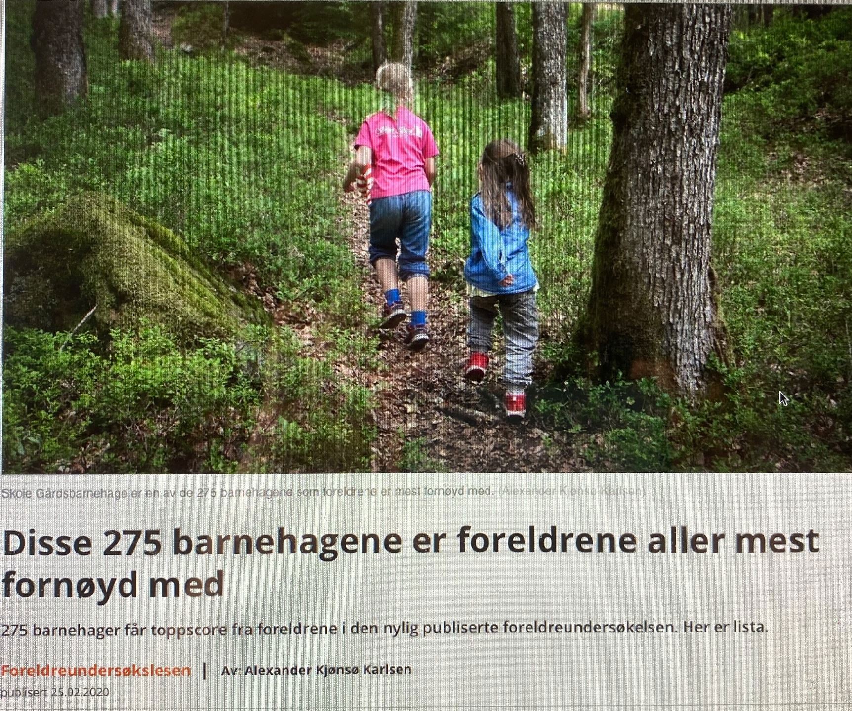 275 barnehager oppnådde toppkarakterene 4,9 eller 5 i Foreldreundersøkelsen til Utdanningsdirektoratet. Av de 275 barnehagene som foreldrene er mest fornøyde med, er 60 kommunale og 214 private. Kardemomme står i år igjen på denne listen og det er vi veldig stolte av! Kardemomme barnehage - barnas BESTE! Les artikkelen og se hele listen på www.barnehage.no.