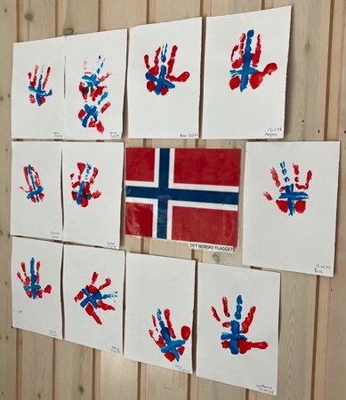 ...markerte vi dagen i strålende solskinn og både barnehagen, små og store var pyntet til fest! Vi hadde fellessamlig ute hvor vi høytidelig reiste oss og sang med til "Ja, vi elsker". Etterpå gikk alle i tog rundt barnehagen til fengende korpsmusikk, mens vi viftet med flaggene og ropte hipp hipp hurra. Deretter var det duket for svampekast og potetløp, før vi koste oss med pølsebod og deilig hjemmelaget smoothie-is. Nam nam! Kasper og Jesperavdelingen fikk også være med i barnehagenes 16.mai-tog med Kampen skolekorps. Hipp hipp hurra for en super feiring!