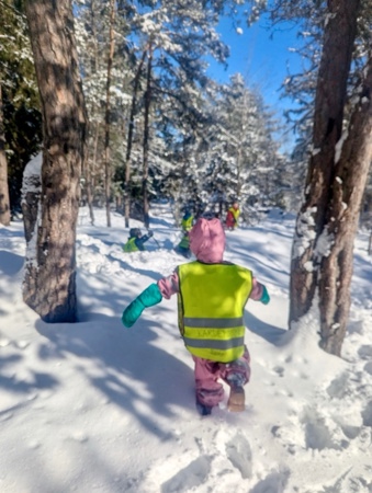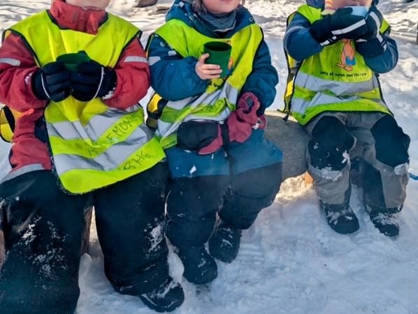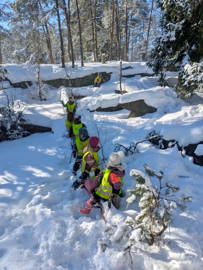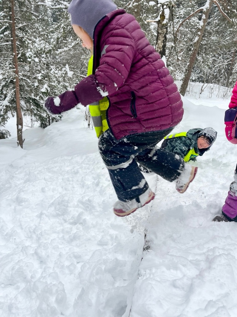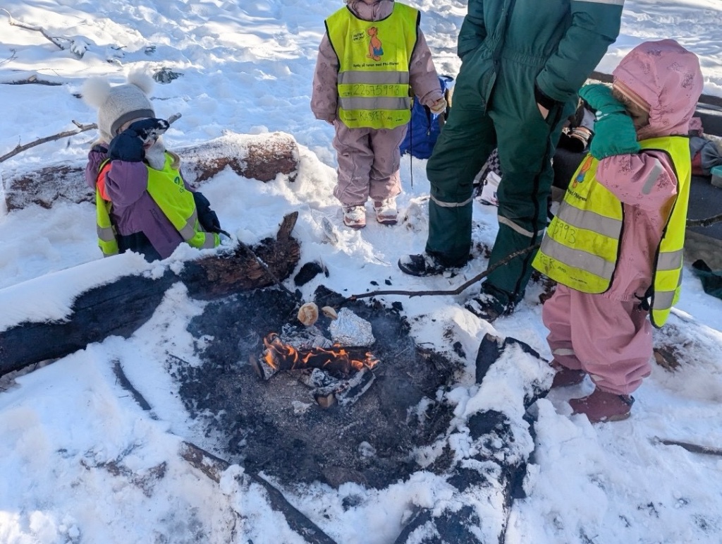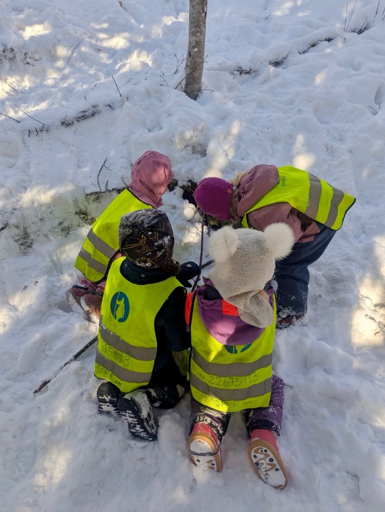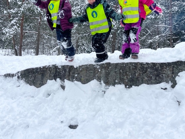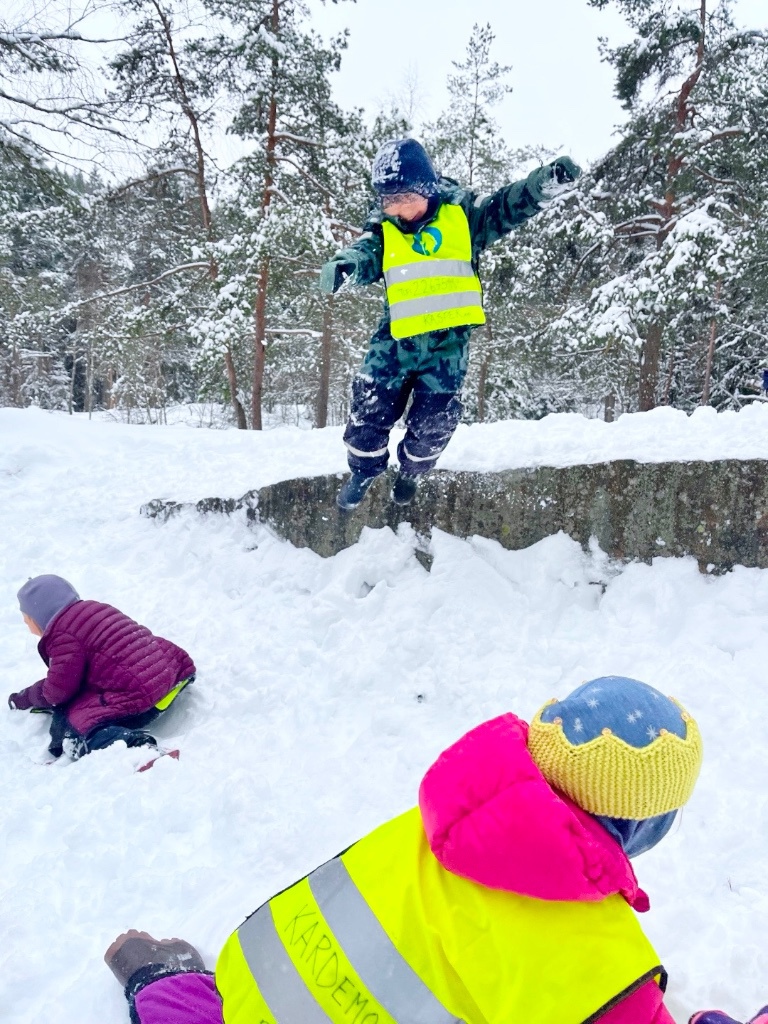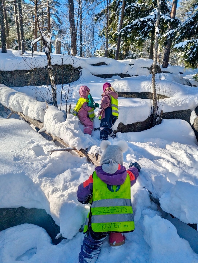 Skogen byr på variert terreng og muligheter for fysisk utfoldelse som utfordrer grovmotorikken, samt oppmuntrer til utforsking og undring. Her kan alle finne utfordringer på sitt nivå og oppleve mestring. En knaus blir super å hoppe fra, en stamme fin å klatre og balansere på, og en pinne har utallige muligheter. Turer styrker fellesskapet i barnegruppen og bygger trygghet og tilknytning mellom barna og de voksne. I Kardemomme ønsker vi å gi barna gode erfaringer med friluftsliv året rundt. Og ingenting smaker bedre på tur i vinterkledd skog, enn pinnebrød på bålet og en varm kopp kakao💚🔥