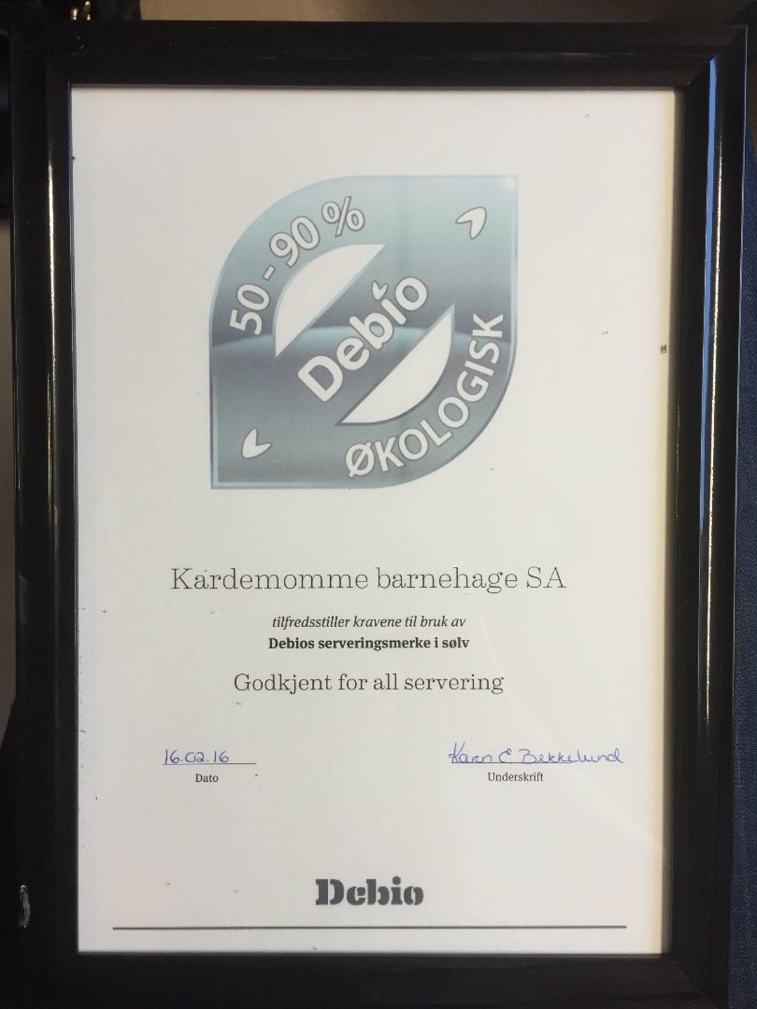 Vi er stolte av at Kardemomme har fått godkjenning for Debios serveringsmerke i sølv. Det vil si at vi følger kravene i regler for bruk av Debios merker i serveringer, og at det vi serverer av mat i barnehagen skal ligge mellom 50-90% økologisk. I Kardemomme ligger vi nå på 70% økologisk mat (beregnet ut fra innkjøpssum).