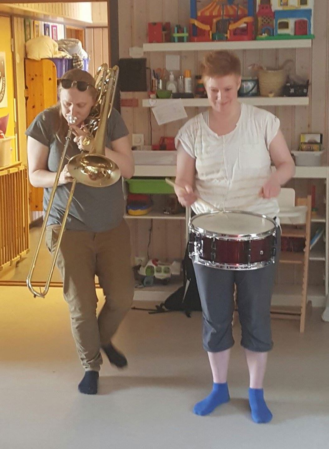 I dag var vi så heldige å få besøk av Helene og hennes venninne Eli som hadde en liten konsert for oss. Helene spiller trombone og Eli spiller tromme, og de viste frem instrumentene sine og hvordan man spiller på dem. De laget mange morsomme lyder (elefant, racerbil, ku) og sammen spilte og sang vi flere kjente barnesanger. Til slutt marsjerte vi og Jonatanbarna fikk lov til å prøve trommen. Det var gøy!